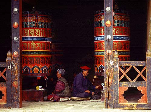 寺院には必ず、大きな極彩色の「まに車」がある。皆、無心に「まに車」を回し続ける。極楽浄土への願いを込めて、いつまでも回す。 手前のおじさんの前に飾ってあるのは、いつか此処を訪れた外国人旅行者に撮ってもらった、自身のポラロイド写真。自慢の逸品。