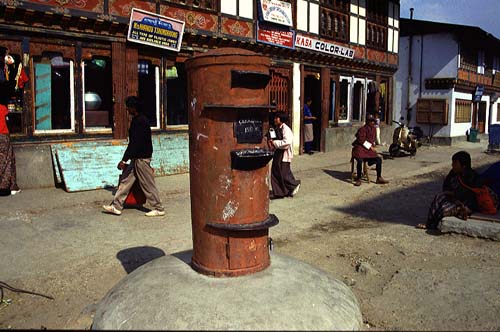 首都ティンプーの目抜き通りで見つけた郵便ポスト。 ここまでくれば、ちょっとしたオブジェだ。昔の日本の鋳物のポストにも似て、気がなごんだ。 車が少ないので、道のまん中に椅子を出して、座っている。 左の後ろを洋服で歩いているのはたぶん日本人旅行者。