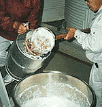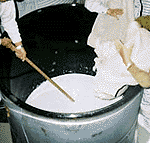 添仕込みから仲仕込みへは、さらに大きな桶に移されました。白く泡立っている醪からはリンゴのような香りがしました