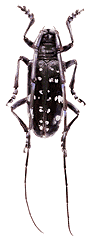 成虫は長い触角と青黒いツヤのあるカミキリムシで、足は青灰色の小さな毛でおおわれている。平地から低山地でごくふつうに見られる。クワ、ヤナギ、ポプラ、イチジク、ミカンなど、いろいろな木に集まり、生木の樹皮や葉を食べ、また樹液もなめる。メスはこれらの樹皮を食い破って産卵し、ふ化した幼虫は木のなかで育ち、穴をあけるところから鉄砲虫(テッポウムシ)と呼ばれる。木を枯らしてしまうため、果樹園などに大きな被害をあたえることがある。