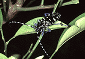 中によく飛ぶが、夜、灯火に飛んでくることもある。成虫は胸をすり合わせてチイチイと音をたてる。
