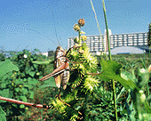 草原や川原、土手などにすむ、なじみ深い昆虫のひとつ。オスの羽の重なり合う部分が発音器になっていて、昼間、草などにとまってチョン・ギース、チョン・ギースと鳴く。色は緑色か褐色で、褐色のものは俗にアブラと呼ばれることがある。