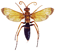 オスは黒色で全体に黄色のしまもようがあり、メスは腹が黒で胸と足が黄褐色と、オス、メスの特徴があまりにも違うため、長いあいだ別の種類だと考えられていた。