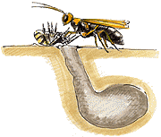 地を好み、海岸近くの花などをよくおとずれる。単独生活をしていて、獲物はクモだけ。クモの巣の上のクモを挑発し、タイミングをみて突き落とし、すばやくクモの背中に乗って、ハリを刺し、クモをマヒさせる。こうしておいてから地面に穴を掘り、クモを穴にいれて卵を産み、土でふたをする。