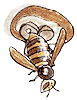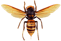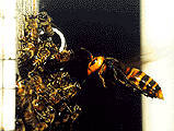 日本で最大のハチ、別名オオスズメバチ。毒性ももっとも強力で、刺されるとたいへん痛い。こん棒でなぐられたような痛さだという人もいるほどだ。多数に刺されると、ショック死することがあるから、見つけても近よらないようにしよう。